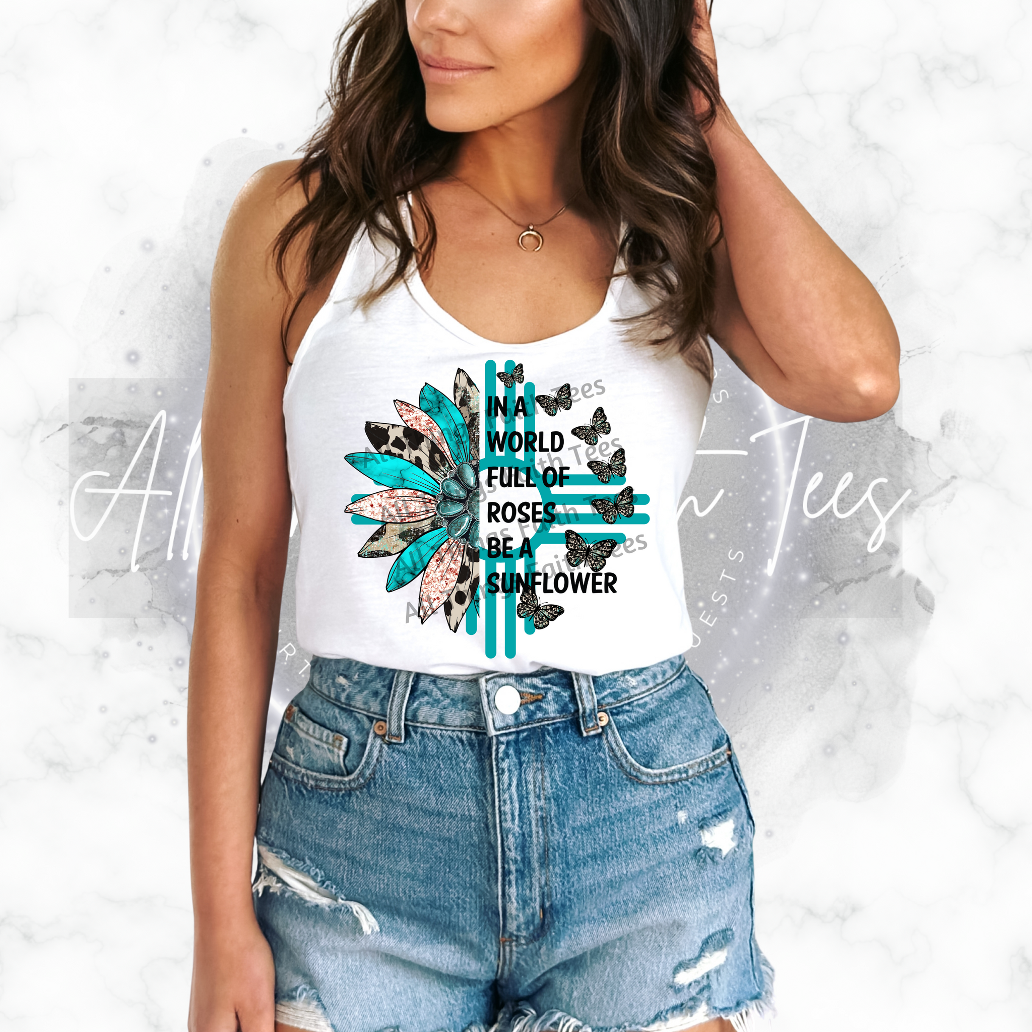 Bring a bold, western vibe to your wardrobe with our "Be a Western Sunflower" Tank TopĀ Featuring a striking sunflower design with turquoise and leopard-print petals radiating around a rustic Zia symbol center, this top is perfect for country concerts, casual outings, or just showing your southwestern spirit.