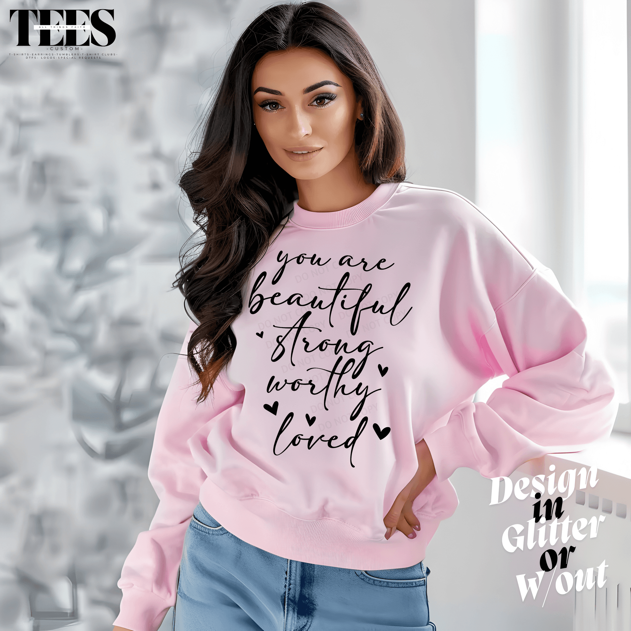 Express your inner strength with the "You Are" T-Shirt and crewneck sweatshirt. Each faith based graphic t shirt features meaningful words like "beautiful," "strong," "worthy," and "loved." These messages remind you and others of positivity and value.