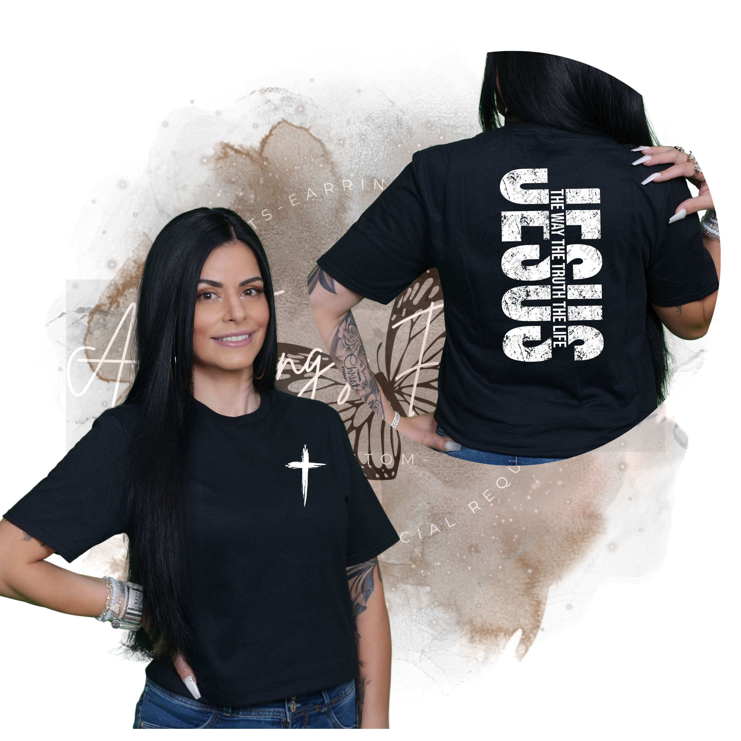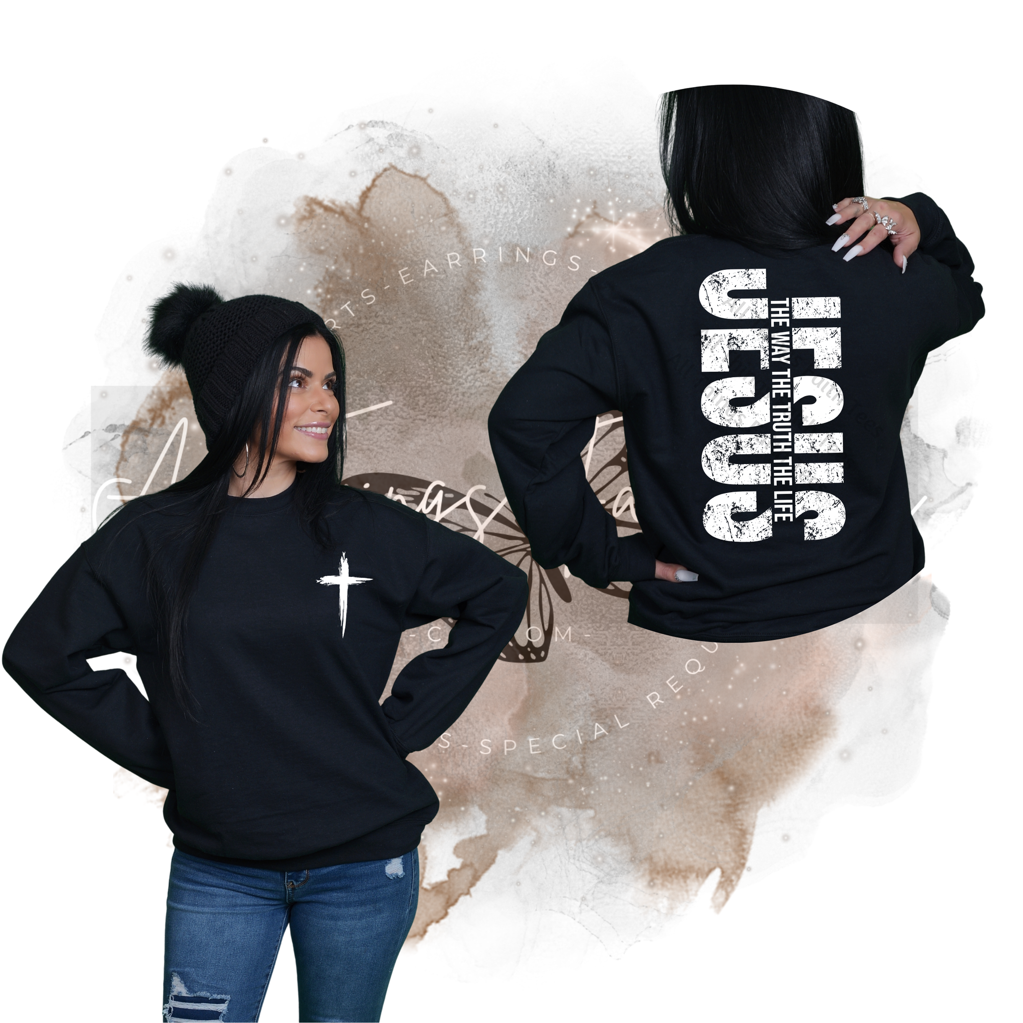 Bold faith. Simple truth. The "JESUS" T-Shirt /Crewneck Sweatshirt is designed to make a statement without saying a word. Featuring a minimalist cross on the front and “Jesus – The Way, The Truth, The Life” boldly printed on the back, this tee is a powerful reminder of who we live for.