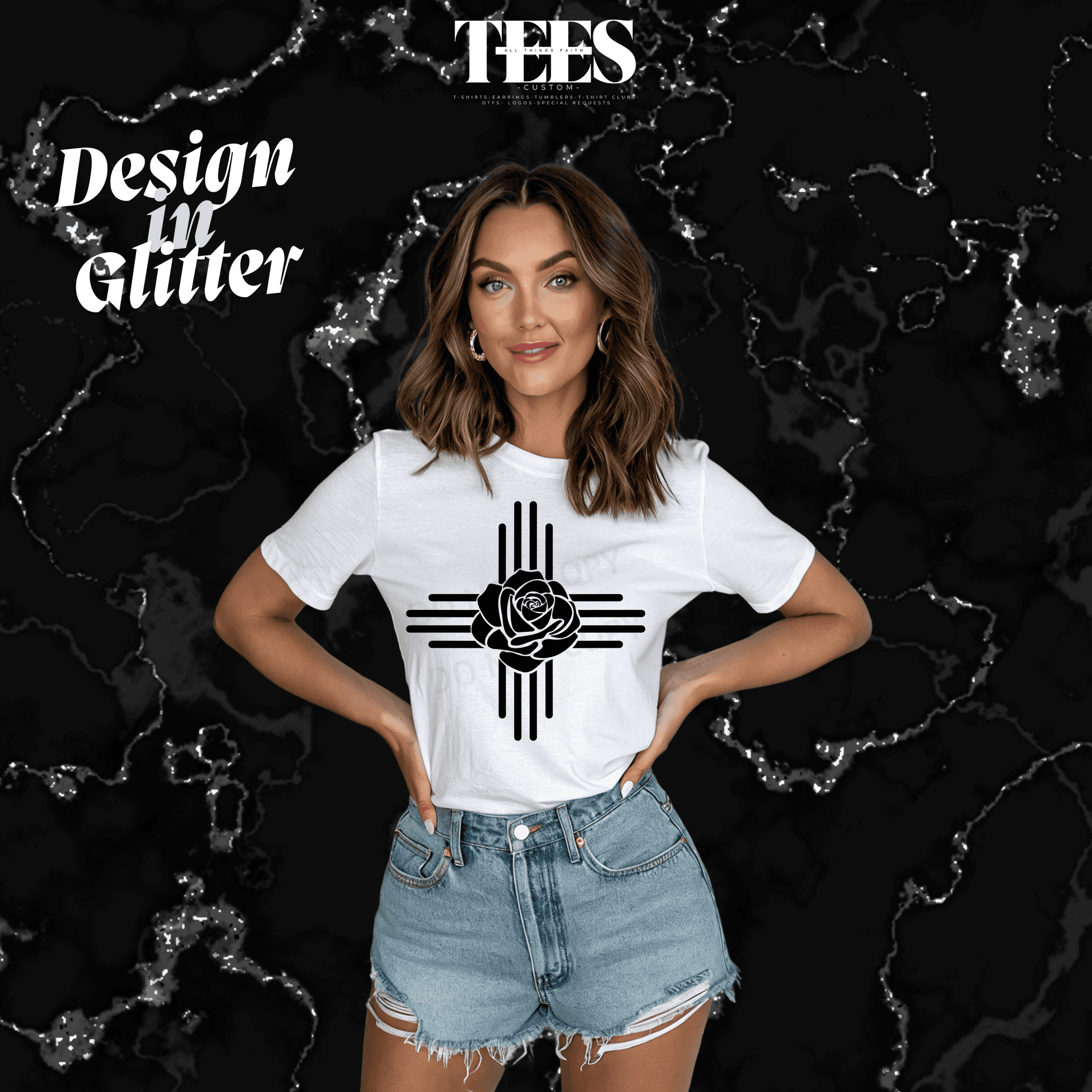 The "New Mexico ZIA Glitter Rose" T-Shirt adds a bright sparkle to your wardrobe. This unique piece from All Things Faith TEES shines with a glittery Zia symbol. The artistic rose detail stands out against soft fabric.